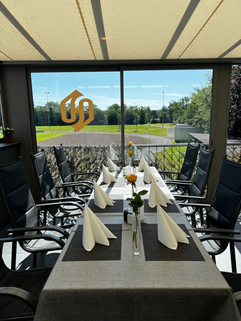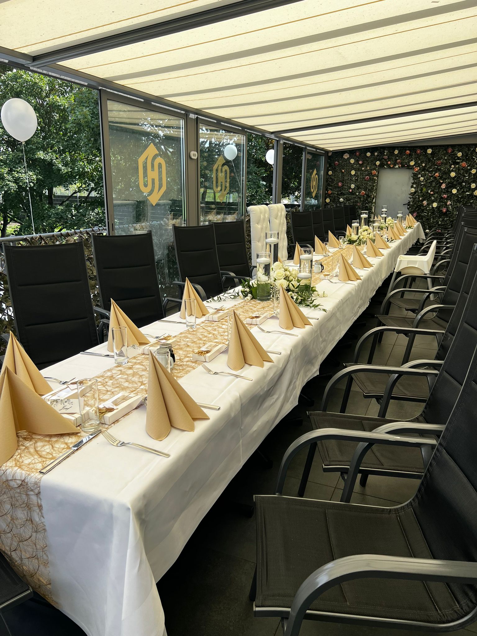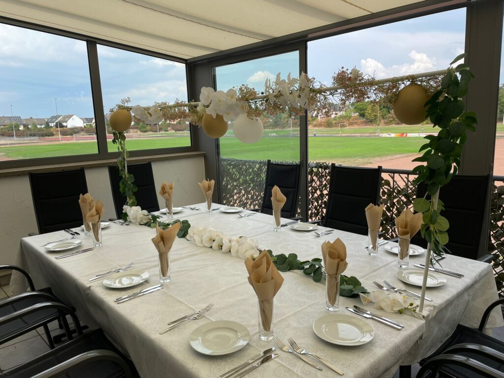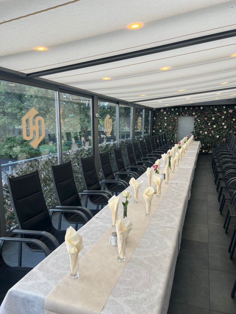 Unsere Terrasse bietet Platz für bis zu 30 Personen und ist ideal für kleinere Feiern wie Verlobungen, Hochzeiten, Geburtstage, Jubiläen, Babyshowers, Trauerfeiern und Geschäftstreffen. Die Atmosphäre ist entspannt und zugleich elegant – perfekt für besondere Anlässe.